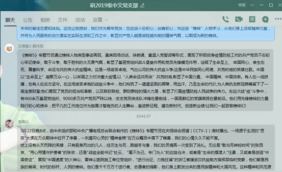 2021年4月6日下午7:30,研2019级中文党支部线上开展《榜样5》学习活动,党员在线下自主观看《榜样5》后,在支部群内交流分享心得感受,此次会议由支部书记何佳同志主持。