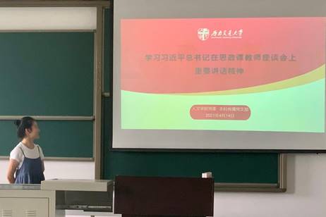 会议伊始,由本科广告党支部吴佳媛同志带领学习第一个主题。内容主要分为两大板块,第一部分为学习习近平总书记在思政课教师座谈会上重要讲话精神。习近平总书记强调,青少年是祖国未来的希望,必须扣好人生的第一颗扣子,在大中小学循序渐进、螺旋上升地开设思想政治理论课,引导学生增强“四个自信”,厚植爱国主义情怀,把个人理想自觉融入伟大的中国梦之中。因而,思政课作用不可替代,思政课教师队伍责任重大。在此,吴佳媛同志分享了她的个人经历:她的高中思政老师有幸参加了思政课教师座谈会,并向其他老师们、同学们交流分享习近平总书记所提及的思政精神,给她留下了深刻的印象。此外,吴佳媛同志重点强调了党中央对思想政治工作的高度重视,党始终坚持马克思主义指导地位,大力推进中国特色社会主义学科体系建设,为思政课建设提供了根本保证。