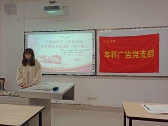 本科广告党支部在x4129开展“习近平总书记在第二届联合国全球可持续交通大会开幕式上的主旨讲话”专题学习活动。本次会议由白奇玉同志主持。