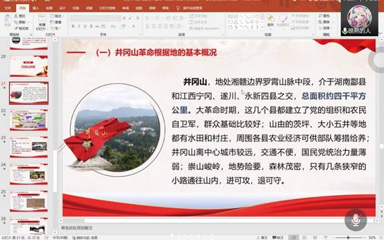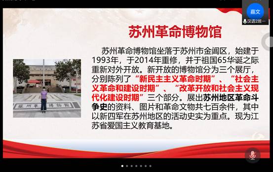 接下来的学习内容,是由第四小组负责的支部特色活动,家乡红色基地打卡汇报,主题为“游革命基地 做优秀党员”。此次汇报分为两部分,第一部分为参观苏州革命博物馆,瞿嘉文同志首先介绍了苏州革命博物馆的特点和概况,其次展示了以日本租界界碑、日本租界地图为代表的馆藏展品,随后从新民主主义革命时期、社会主义革命时期、建设及改革开放和社会主义现代化时期的三个展厅出发讲解了馆内的基本陈列,最后总结了在此次参观中学习感受到的革命精神。第二部分为参观井冈山革命博物馆,秦一心同志从地理状况、战略地图和代表将领三方面介绍井冈山革命根据地的基本概况,并依次讲述了创建、全盛、曲折发展和后续斗争四个时期的斗争历史,最后弘扬了井冈山精神,以及对共产党员如何传承、践行井冈山精神发表了自己的见解。