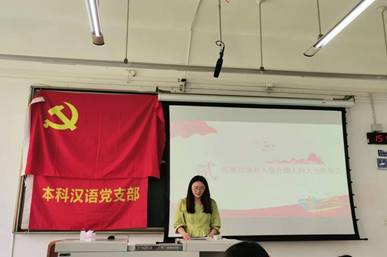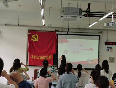 会议的最后,在党支部书记刘晗悦同志的领誓下,在场全体党员持立正姿势,举右手、握实拳,面向中国共产党党旗郑重宣誓。宣誓结束后,刘晗悦同志对九位新加入本科汉语党支部的预备党员殷切寄语,希望各位同志能够继续努力,不断进步,成为支部建设的主干和新鲜血液,推动支部继续向前发展。