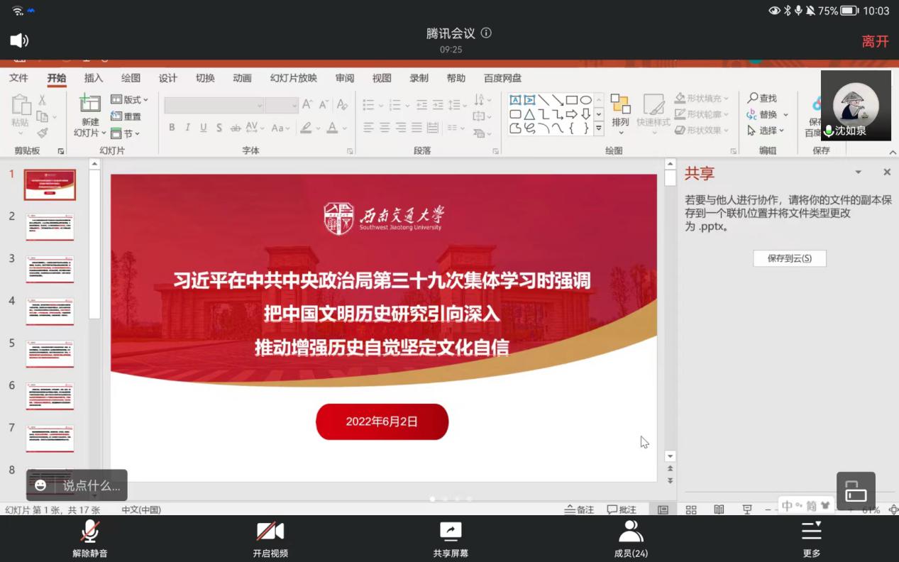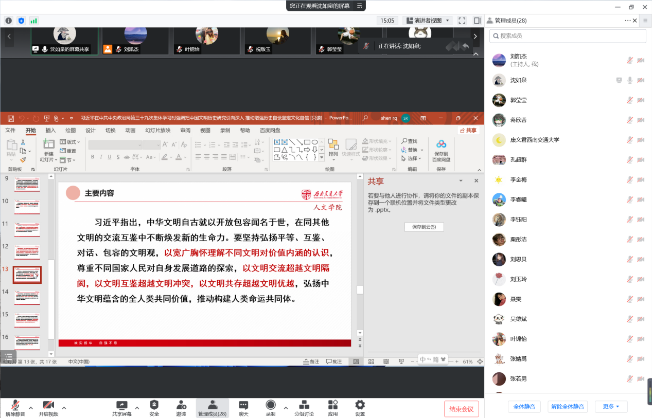沈如泉副院长受邀为研究生2021级中文党支部21名党员和8名入党积极分子以线上平台的方式讲授专题党课。本次党课学习文史相映,缀连古今,进一步促进支部成员对党史的了解和对中华文化的认同。