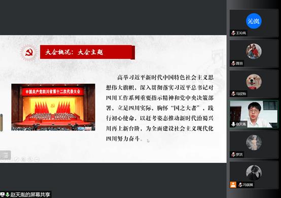 研究生会临时党支部依托腾讯会议APP开展学习贯彻省第十二次党代会精神学习活动。本次活动由本科汉语党支部书记刘晗悦同志主持,特别邀请到西南交通大学交通运输与物流澳门老虎机