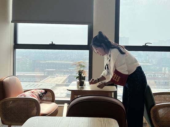 在了解办公区的基本布局之后,参与志愿活动的同志们积极配合组织的安排,两人一组,进行了清扫灰尘、摆放绿植、擦净玻璃等工作。在打扫的过程中,不时有老师经过,我们支部的同志微笑向他们问好,老师们也对同学们表达了发自内心的感谢。