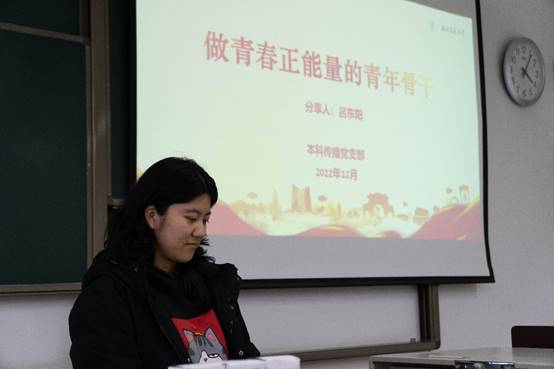 接下来,吕东阳同学针对“做什么样的青年骨干”对广大青年学生做了进一步的分析和解释。她首先提出“官僚化”现象产生的三个主要原因,从反面论证了青年骨干形象及社会责任感的重要性。然后表明“青年要站在奏响时代强音的前列,引领、传递、担当,做‘堪当民族复兴大任的时代新青年’,绝不做‘幼稚的职业社会活动家’”、“要站在服务同学成长成才的前列,用心、关心、细心,做‘忠恕任事的同学服务员’,绝不做‘轻浮的坐而论道空谈客’”、“要站在承担民族复兴重任的前列,拼搏、奉献、梦想,做‘一身正气的青年奋斗者’,绝不做‘庸俗的精致利己主义者’”。