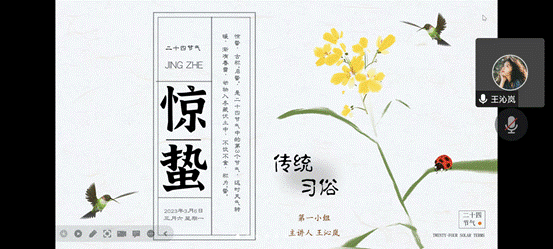 首先,领学人刘烁同志向大家简要介绍了“惊蛰”节气的节气起源、节气三候、节气习俗、节气农事的大致内容,随后四个小组依次进行分享交流。