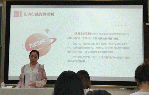 接着,胡红同志讲解了党员所享有的八项基本权利以及党员权利的特点,并强调党员要正确行使自己的权利,坚持实事求是、民主集中制的原则。