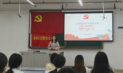 2023年4月28日晚19:30,本科汉语党支部于X1213教室召开2022-2023学年第四次党员大会。本次会议共有三项议程:一、支部大会讨论并表决预备党员转正申请;二、支部大会讨论接收预备党员;三、支部大会讨论2021-2023年“两优一先”表彰推荐工作。本次支部大会由本科汉语党支部书记刘晗悦同志主持。