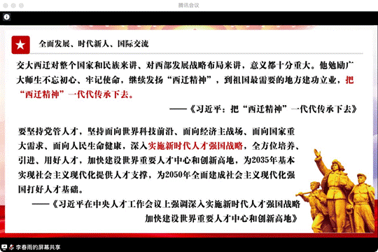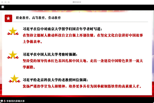 研2022级中文党支部联动本科汉语党支部依托“腾讯会议”APP线上开展“学思想、强党性、重实践、建新功”读书交流会,集体学习习近平总书记关于教育的重要论述。本次会议由李春雨同志主持,由研2022级中文党支部第四小组领学,两个支部全体党员及入党积极分子参与学习。