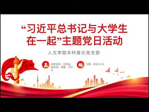 本科音乐党支部线上开展了“习近平总书记与大学生在一起”主题党日活动。本次会议由孙雨函、张兆悦、闻茜和王杉杉担任领学人,支部全体同志参与活动。