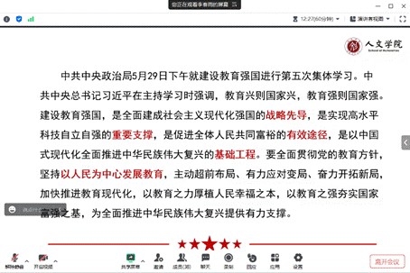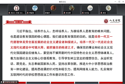 研2022级中文党支部联动研2022级传播哲学党支部依托“腾讯会议”APP,专题学习习近平总书记在中共中央政治局第五次集体学习时的重要讲话精神。本次学习由研2022级中文党支部书记万心怡同志主讲,支部全体党员及入党积极分子参与学习。