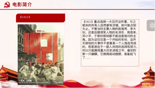最后,陈新季同志分析了《1921》里的红船精神。陈新季同志认为,红船精神展现了我们党坚定航向、风雨同舟的自信豪迈的形象,也在新时代激励我们将勇立潮头与顺应潮流相统一,走适合中华民族崛起并造福全人类的路。