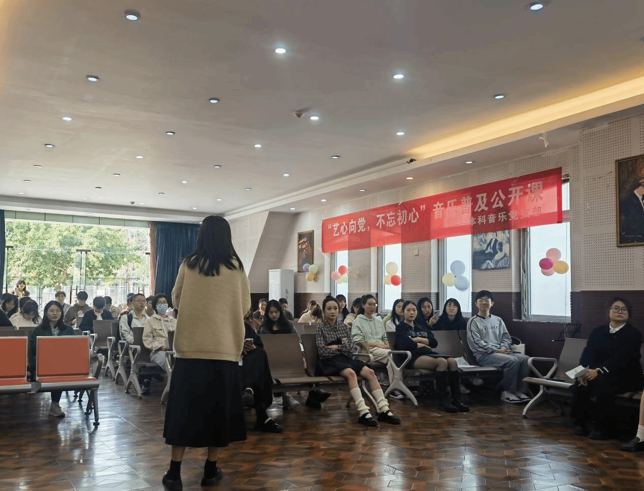 首先是本科音乐党支部举办的“艺心向党,不忘初心”音乐普及公开课。活动开始,郭佳同志以一把尺子巧妙地引入课堂,随后讲解到多种记谱方式,重点介绍简谱基本知识。接下来,王伊伊同志通过《本草纲目》歌曲带领大家感受横膈膜带来的力量,并以“吹纸条”比赛检验气息学习成果。气息练习结束后,由王伊伊同志带领大家逐句学习歌曲《成都》。通过教唱,同学们对歌曲的换气有了更清晰的感受。接下来的第三个环节,声乐表演专业的赵嘉怡同志和商玺玥同志分别演唱民族歌曲《青玉案·元夕》和美声歌曲《假如你爱我》,钢琴表演专业陈冉冉同志演奏了《塔兰泰拉舞曲》。