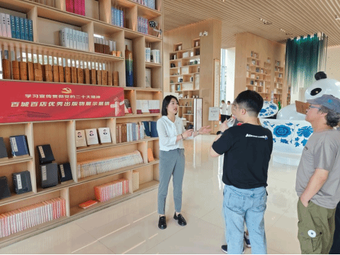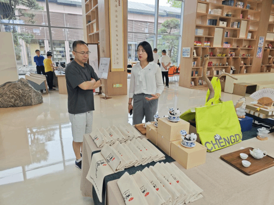 此外,打造特色文化IP,也是溪云书院拥抱文旅融合发展机遇的关键一招。在书院大厅的文创展柜上,一个个憨态可掬的大熊猫成为不同文创展品上的共同主角,吸引了传播支部师生一行的眼球。工作人员向大家介绍道:“这是书院的专属IP‘盖碗熊猫’,大家可以看到像这里的双面蜀绣、手工竹编以及其他许多文创产品都是围绕这一IP符号进行设计的。”