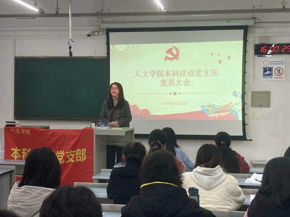 2024年11月21日下午4时,本科汉语党支部于X1223开展主题党日活动。会议由支部书记刘晗悦主持,支部全体成员参加。