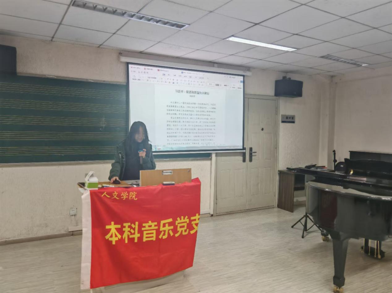 随后,由伍成莹同学带领大家学习了习近平总书记在中共中央政治局第十七次集体学习时的重要讲话精神,以及《求是》杂志发表的习近平总书记重要文章《在文艺工作座谈会上的讲话》,文章强调了为什么要高度重视文艺和文艺工作以及如何创作无愧于时代的优秀作品等问题。