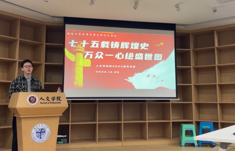 随后,研2024级党支部的郦炫竹同志以“七十五载铸辉煌史,万众一心绘盛世图”为主题,围绕交大人陈能宽先生的一生,讲述他和国家共同成长,与时代同频共振的故事。通过郦炫竹同志绘声绘色的讲述,全体与会人员清晰地领略到了新中国的风雨兼程,深入思考了个体如何在时代的浪潮中找到自己的定位,回应时代的召唤。