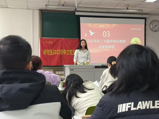 研究生2023级中文党支部于九里校区J4220开展3月主题党日活动。主要内容有:《教育强国建设规划纲要(2024—2035 年)》、习近平总书记在《求是》杂志发表的重要文章、习近平总书记在二十届中央纪委四次全会上的重要讲话、中国共产党第二十届中央纪律检查委员会第四次全体会议公报、《健全全面从严治党体系》以及2025 年全国教育工作会议召开的有关新闻。本次活动由党支部书记王艺橙同志主持,支部成员和入党积极分子到会学习。