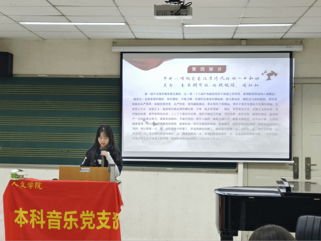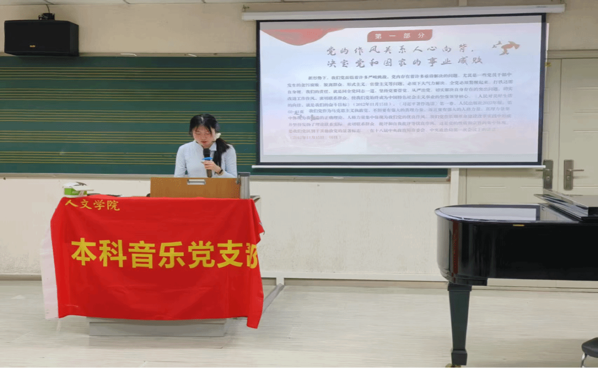 本科音乐党支部在犀浦校区音乐系音专一教室开展4月主题党日活动。本次活动由郭佳同志主持,支部全体成员参加学习。