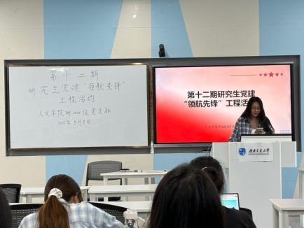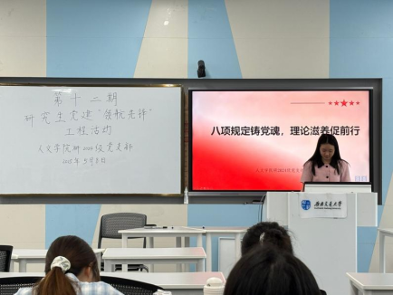 研2024级党支部在九里校区J4204教室开展第十二期研究生党建“领航先锋”工程活动。本次活动由潘诒堃同志主持,支部成员和入党积极分子共同参与。本次活动聚焦中央八项规定精神的深入学习与贯彻落实,旨在推动全面从严治党向基层延伸,进一步夯实青年党员廉洁自律的思想根基。