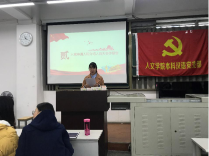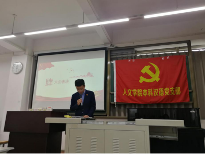 本科汉语党支部第一次党员大会于X8215教室召开,大会讨论和表决了预备党员徐蕾、王岚、徐舟雨、安然四名同志的转正事项以及接受李薇。何飞、罗洪、周芸靖、魏岚五位发展对象为预备党员事项。大会由党支部副书记杨盛果主持。