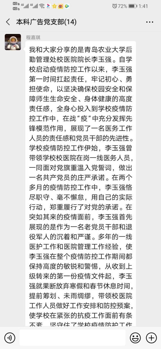 随后,支部成员们互相交流,依次讲述了自己看到的或者亲身经历的战疫故事。池茜同学分享了护送金银潭医院抗疫一线医护人员的武汉快递小哥汪勇的故事,她认为我们要见贤思齐,学习汪勇同志爱岗履责、恪尽职守的敬业精神,协作互助、投身实践的志愿精神,开拓创新、担当有为的时代精神,友善无私、助人为乐的奉献精神,疫情防控斗争贡献自己的力量。紧接着,张宇同学与大家交流了73岁高龄的李兰娟院士高龄出征武汉、不顾自身安危只想救人的赵童医生还有在防控一线因过度劳累而猝死的宋英杰同志等等一个个感人的光辉事迹,她谈到,作为一名预备党员,我们应当向他们看齐,学习他们对初心的坚守,一是要学习他们坚守信念、对党忠诚的政治本色,二是要学习他们敢于担当、恪尽职守的昂扬斗志,三是要学习他们舍身忘我、一心为民的高尚情怀。最后,支部书记李盛兰同志分享了90后女孩甘如意被称为“最美逆行者”的故事,同时联系到自己生活中为抗疫做出贡献的警察、外卖员、志愿者、建筑工人这些无名英雄,让我们看到了疫情当前,每个平凡人都在贡献着自己不平凡的力量。她认为这是舍小我伟大我的精神品质,是中华民族仁爱、善良、付出、舍己为人、义大于利的伟大精神,也是每一个普通人一方有难八方支援的精神。
