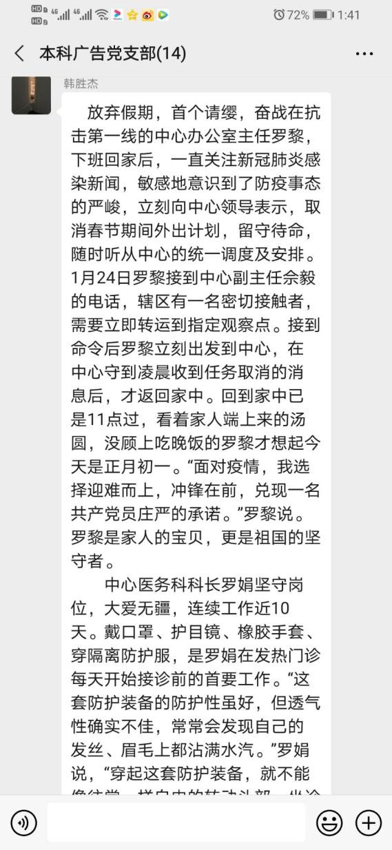 徐丹同志首先带领大家认真学习了一位抗疫英雄——陈薇院士的事迹,陈薇院士先后参与过抗击“非典”、研发埃博拉疫苗等工作,她在大年初一奔赴武汉,是首批进驻疫情重灾区的专家之一。在武汉,她和团队争分夺秒地展开疫苗研制工作,一个多月的闭门研制,殚精竭虑,陈薇院士和团队终于在3月16日研制出重组新型冠状病毒疫苗,并获得审批,可以正式展开临床试验。此次疫情期间,像陈薇院士这样的抗疫英雄层出不穷,14亿中国人民同舟共济、众志成城,坚定信心,同疫魔进行顽强斗争。而我们作为一名光荣的共产党员,更应该积极服从组织的安排,识大体、顾大局,做好先锋模范作用。