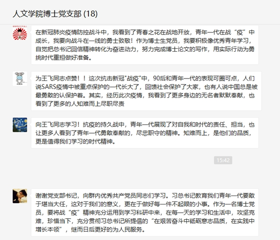 博士党支部在线上进行了主题党日活动。活动主要内容为学习贯彻习近平总书记回信勉励北京大学援鄂医疗队全体“90后”党员的重要回信精神,加强新时代高校青年党员队伍建设。