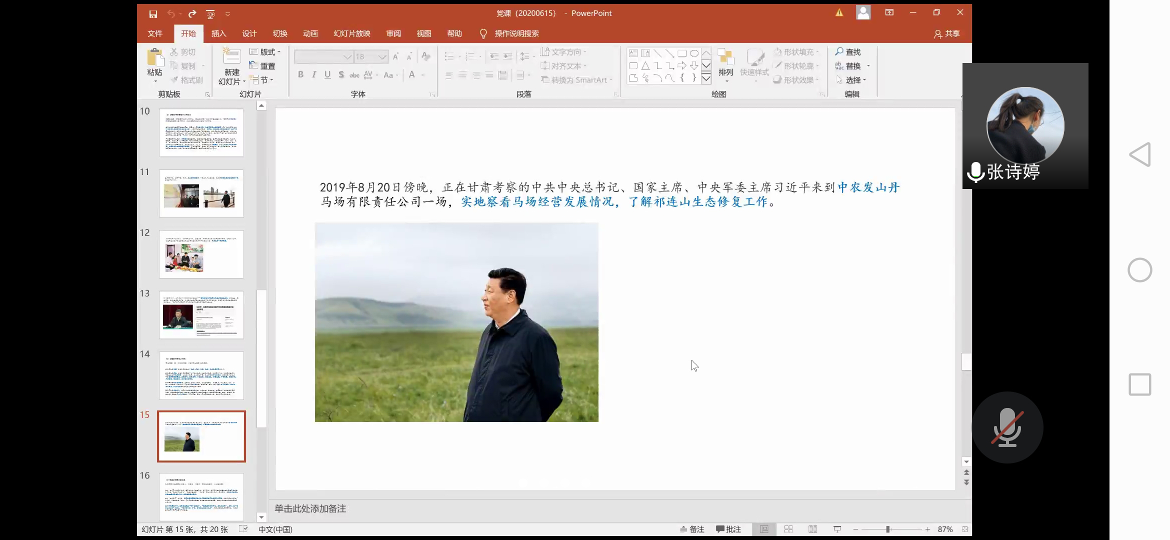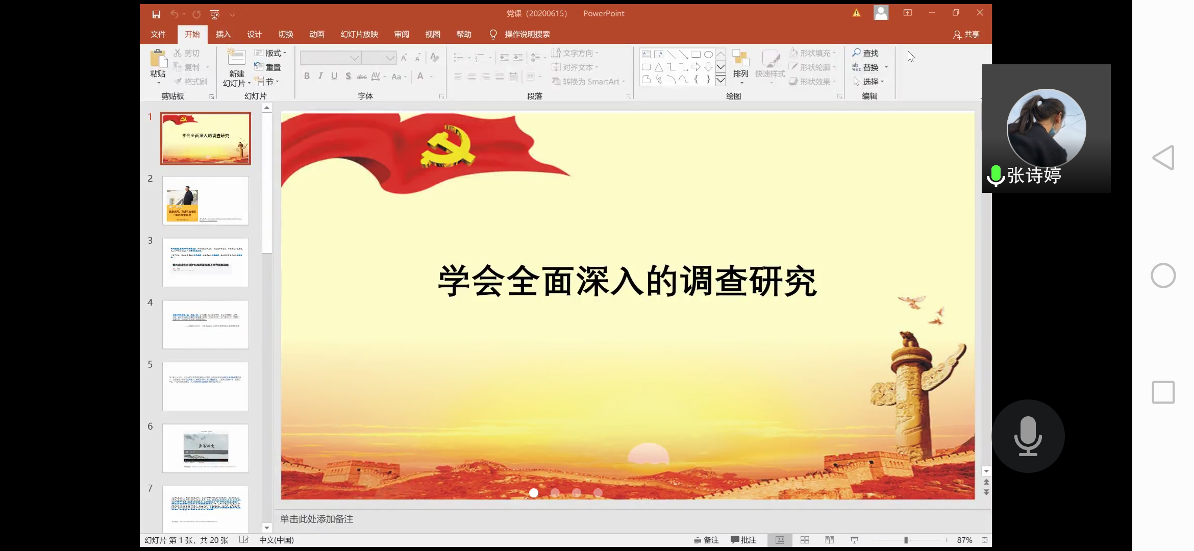 张诗婷老师分别从习近平总书记一年内四次考察黄河、习近平总书记在中央党校进修班开学典礼上讲话时讲述毛泽东开展寻乌调查的例子等切入,分别从调查研究要有问题意识、调查研究要掌握方法和技巧、调查研究要深入细致、调查研究要实事求是以及调查研究的关键在于解决问题等五个方面展开本次专题的学习。