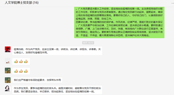 首先,支部书记刘宇同志为支部全体党员做了《让党旗在“战疫”一线高高飘扬——人文博士党支部发挥党员先锋模范作用》的专题微党课。专题微党课的内容包括:深刻领会什么是共产党人的先锋模范作用、“战疫”一线对党员先锋模范作用的要求、“战疫”一线如何发挥党员先锋模范作用。勉励各位党员同志将此次疫情防控作为践行“两个维护”、践行“初心使命”的一次最重要检验,坚决打赢打好疫情防控阻击战。