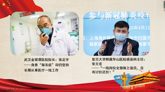 车辆工程专业2013届毕业生周泽民,毕业后入职中建三局。他在疫情期间火速驰援,主动申请成为第一批参与建设火神山医院的“青年突击队”队员,在十天十夜的奋战中,他积极建言献策,与同事铆足干劲,保证了工程进度。此外,栾潇同学还介绍了两位医务工作者,一位是武汉金银潭医院院长张定宇同志,他身患“渐冻症”却仍坚持长期从事医疗一线工作;另一位是复旦大学附属华山医院感染科主任张文宏同志,他“一线岗位全部换上党员,没有讨价还价!”的一番话充分彰显了共产党员的担当和责任意识。