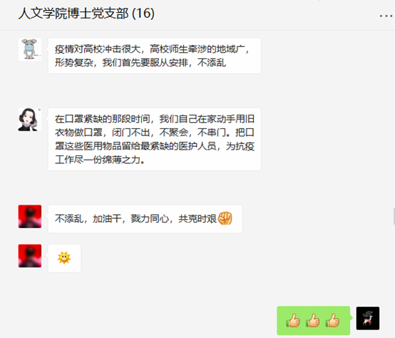刘宇同志从学习的角度指出,通过学习习近平总书记关于意识形态工作和百年未有之大变局的重要论述,推动博士生党员学会历史变局思维、培养意识形态眼光、增强初心使命担当,彰显博士生党员群体在推动学术发展中的作用。闫现磊同志从疫情防控的层面表示,目前新冠疫情防控压力仍然不小,“不添乱,加油干,戮力同心,共克时艰”是我们落实习近平总书记重要论述的好办法。