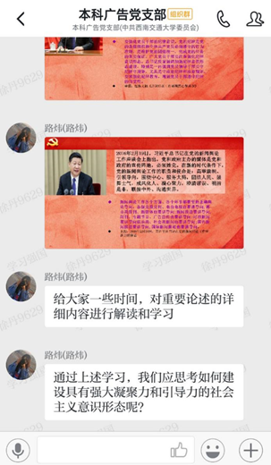 本科广告党支部借助“学习强国”平台,开展了有关“学习领会习近平总书记关于意识形态工作的重要论述”主题党日活动。本次活动由支部路炜同志主持。