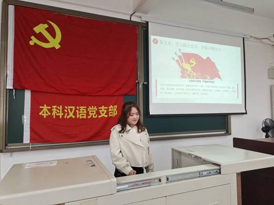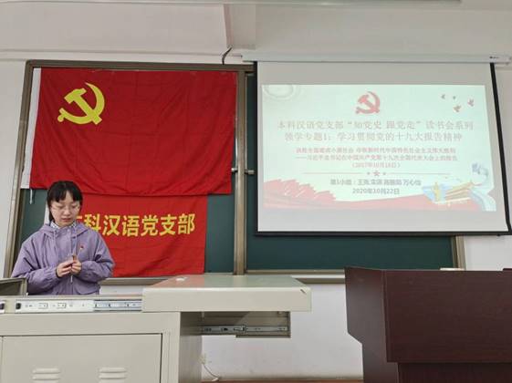 2020年10月22日下午16:00,本科汉语党支部在X8523教室召开会议,积极响应学校党委关于“读党史、学党史、知党史”的学习通知,开展“知党史,跟党走”读书会,督促学生党员在了解中共百年奋斗的历程中领悟共产党人的初心和使命。本次读书会系列专题一由支部的3个领学小组进行集中汇报。
