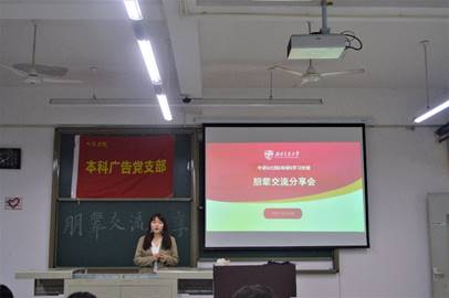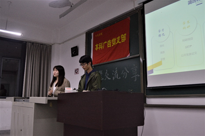 本科广告党支部于X8321举办专业朋辈讲座。本次活动由路炜同志负责主持,孙蕊同学负责现场拍照和新闻撰写。为加强支部与本专业各年级同学的联系,发挥本专业党员同志的先锋模范作用,发扬志愿服务精神,讲座邀请到2017级广告专业王子墨、方彦然、赵文哲、路炜四位优秀同学为学弟学妹们进行竞赛科研、学生工作、出国留学、保研准备、专业学习等相关内容的分享。