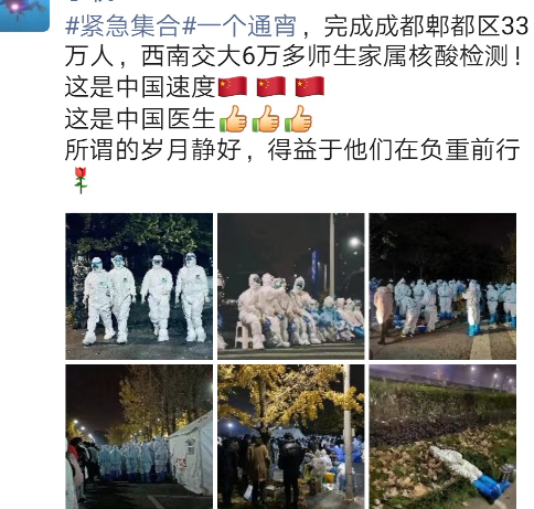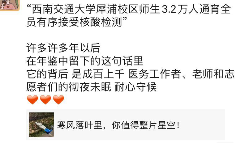 老师们用温暖的话语抚慰着学生:“请大家不要惊慌,听学校的安排,出去做核酸检测时一定要穿厚点,老师相信大家会一切安好的,我们郫县豆瓣一定会赢!”