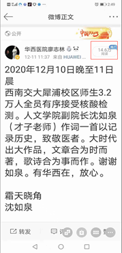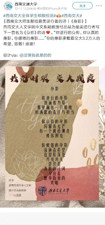 工会主席、交大九三学社基础支社副主委、中文系副教授付品晶写道:“身影 你逆行的身影/饱涵着力量/那里藏着一只雄鹰/和满眼的责任与担当/你认真的身影/闪耀着光芒/每一个被检测者/被你照亮/你疲倦的身影/流淌着希望/在星辰深处/月亮湾头/潜伏着/奔腾的江河/孕育着/繁华街市的/欢唱”