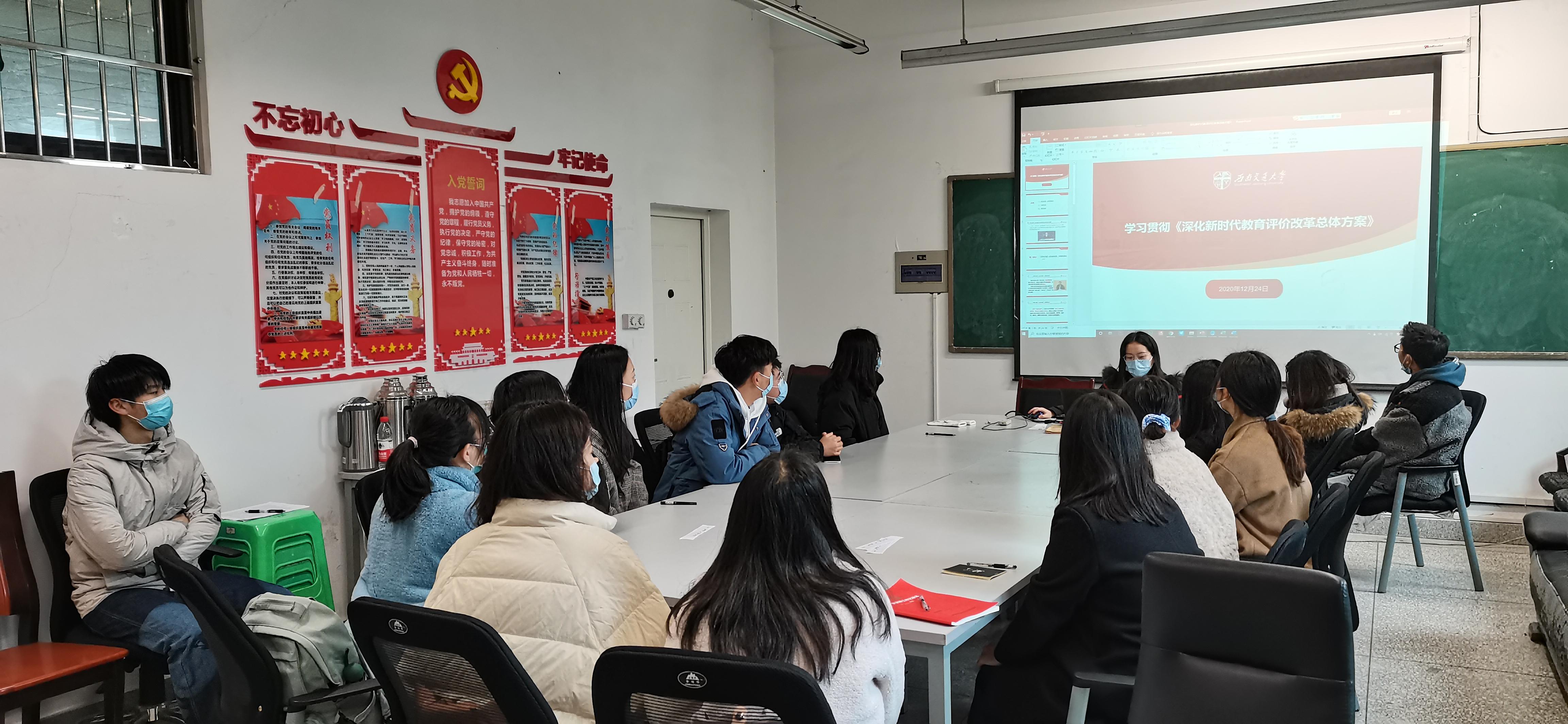 研究生2020级传播哲学党支部开展了“学习贯彻《深化新时代教育评价改革总体方案》”的主题活动。本次活动全员参与,由传播哲学党支部副书记闻英同志担任主持。