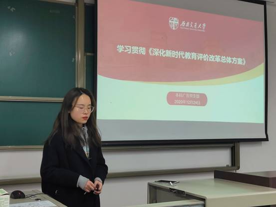 本科广告党支部在X8323开展深入学习贯彻《深化新时代教育评价改革总体方案》专题学习会。会议由甘倬蔓同志主持。