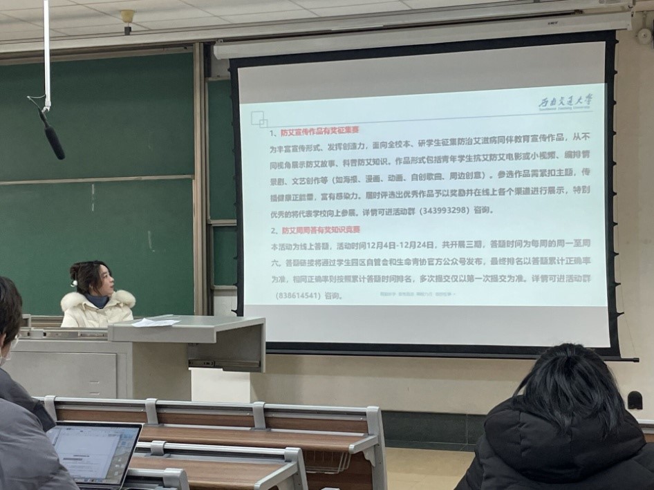 2021级研究生新生在西南交通大学九里校区四教4422举办了以“生命至上 终结艾滋 健康平等”为主题的年级大会。