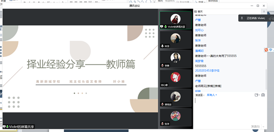 研2018级毕业生叶小维师姐进行教师行业分享。叶小维师姐现任高新区新城小学六年级班主任、语文教师,她从成为教师前的准备、面试注意事项、教师工作的利与弊和教师职业晋升途径四方面进行讲解。首先在成为教师准备中叶小维师姐提到教师应当具备教师资格证、普通话证书等硬性条件,同时要有相关实习经验、学生干部经历等加分条件;其次在面试中不可打无准备之仗,除了区分学校外还应注意职业形象、学科知识储备等内容;同时小维师姐从个人经验和工作感受出发讨论了实际的教学工作和教学状况,希望同学们对于教师行业树立正确认知,怀揣教育热情拥抱这一职业。最后在教师职业晋升途径和学生提问的探讨中,小维师姐的经验分享落下帷幕。