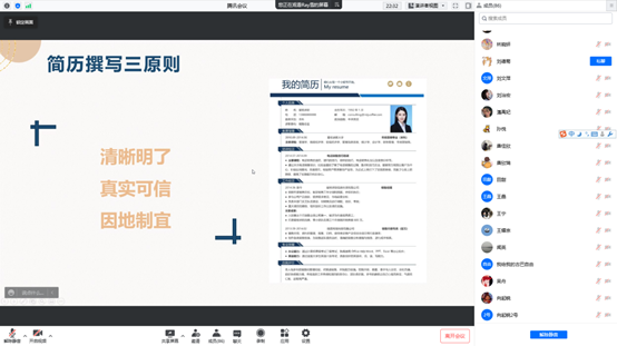 最后罗老师提出简历撰写要注意内容的必要性和投递的策略性,提醒同学们在简历优化的具体思路中应当注意分析意向岗位和自我匹配度、放大自我优势从而优化简历。罗老师深入浅入的简历剖析赢得了不少同学的青睐,同学们积极踊跃提问,受益匪浅。随后,林老师总结了罗老师的简历分析要点,同时补充了简历撰写可通过数字、中英文动词帮助措辞、通过排版突出竞争力等简历优化技巧,并对罗老师深入细致的简历培训表示感谢。