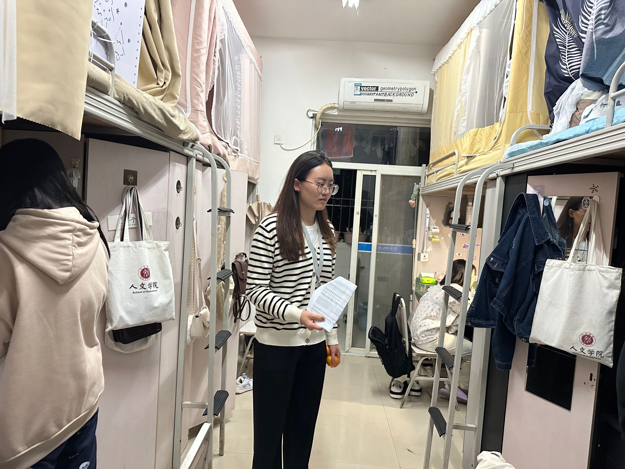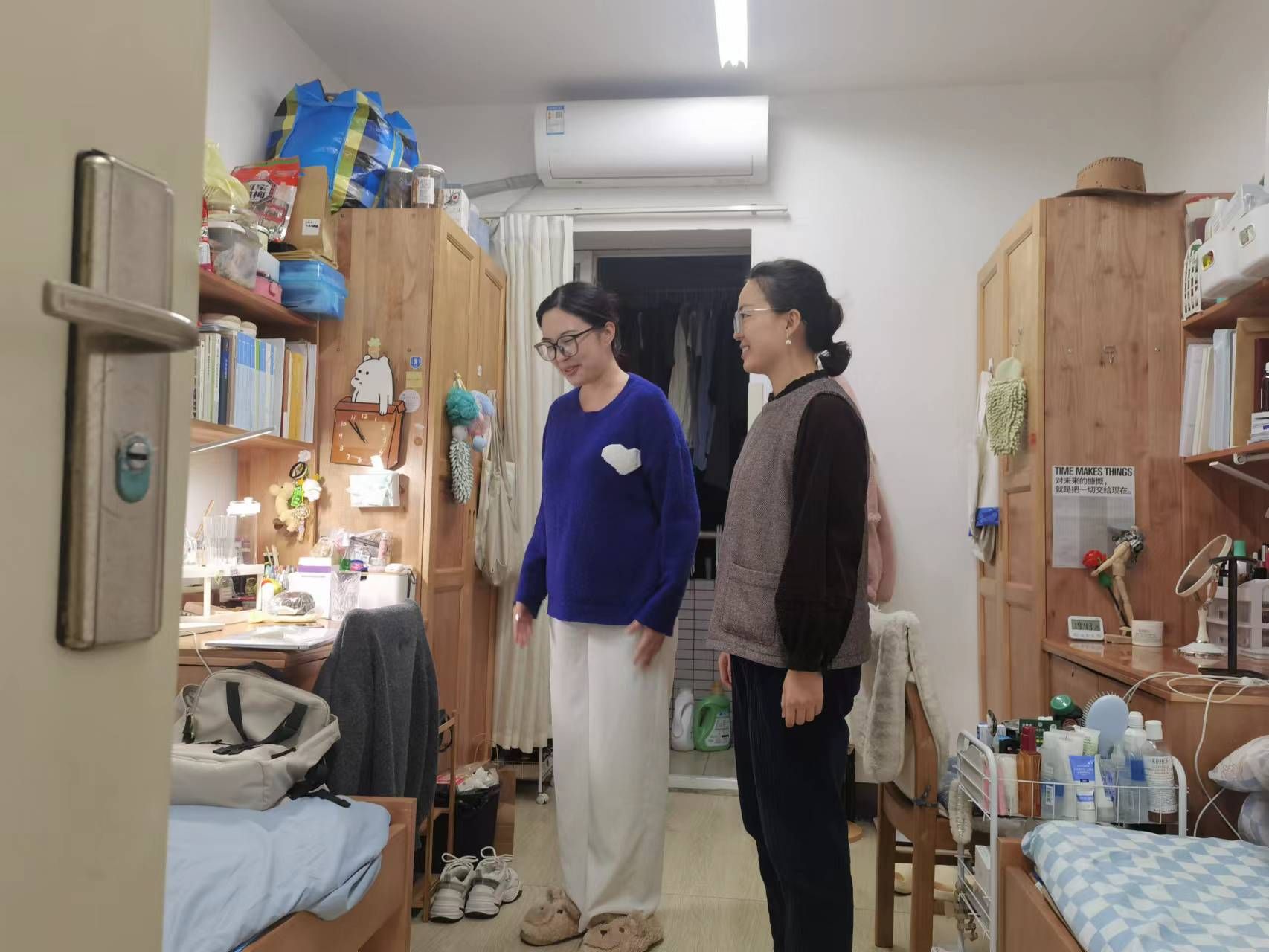 刘晗悦老师走访了2023级本科生宿舍,认真检查了宿舍的安全情况,并关心了同学们的身体健康,提醒学生注意添衣保暖,预防流感。周桎宏老师与罗乔美老师分别前往2021级本科生以及2022级本科生宿舍。两位老师询问了同学们的学习生活情况,提醒各位同学注意宿舍安全,共同营造良好的生活、学习环境。