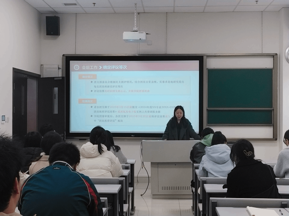随后,文璐老师围绕组织生活会的流程、团员教育评议的方法及相关注意事项等进行详细讲解。文老师向大家介绍了会前准备、会议召开、会后总结等关键环节的基本要求和纪律规范,同时强调,在进行自我评价和组织评议时应实事求是、严肃认真。此外,文老师带领大家明确了相关材料的提交时间,演示了“智慧团建”系统的录入操作。