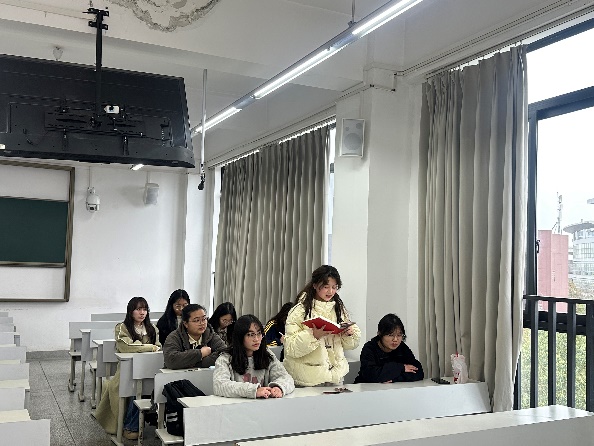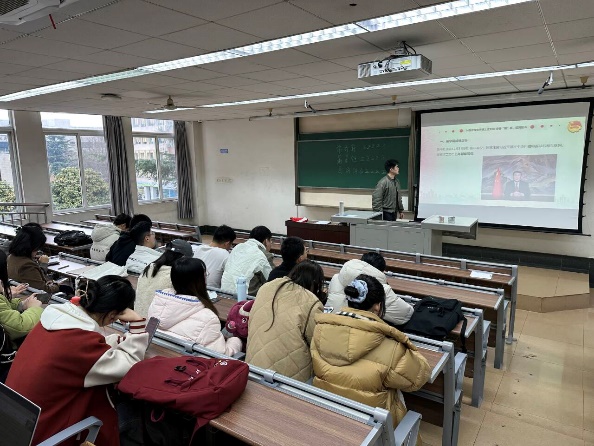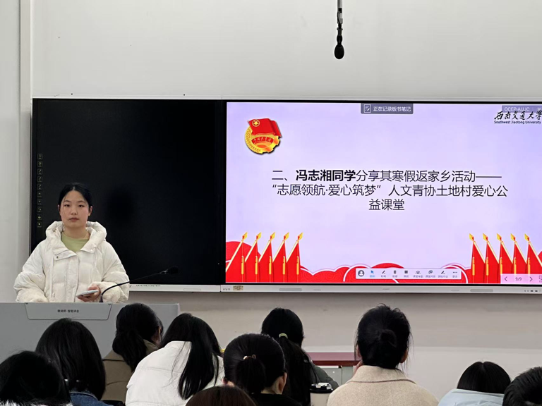 本科2023级汉语1班团支部的冯志湘同学在团课上向同学们分享了其参加的寒假返家乡活动——“志愿领航 · 爱心筑梦”人文青协土地村爱心公益课堂的实践经历,深入浅出地阐述了新时代青年的责任与担当,并鼓励同学们在新学期勇于突破自我,积极参与社会实践,在服务他人、服务社会中实现人生价值。