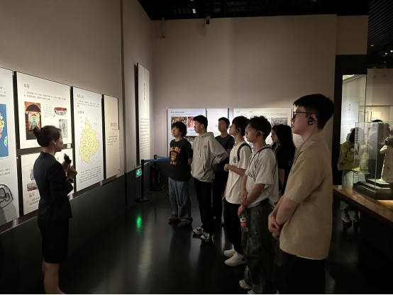 循着历史脉络,同学们步行前往成都博物馆,开启“交通文化与国际交流”探索之旅。在“花重锦官城——成都历史文化陈列”展厅,古代蜀道模型、都江堰水利工程沙盘等展品,生动展现交通建设与文明演进的共生关系。博物馆讲解员结合“一带一路”历史渊源,为同学们解读交通在跨文化交流中的纽带作用,引发大家对现代交通哲学的深度思考。