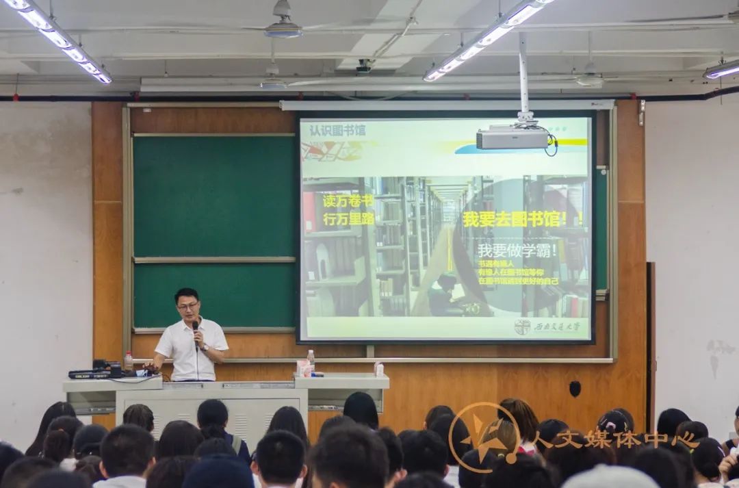 的新生做入馆教育,有很别样的感触。入馆教育主要从三个方面进行,介绍几个人、认识一个馆、骑上几匹“码”。孙老师首先介绍了机车车辆专家沈志云院士、CCTV财经频道特约评论员刘兴亮、“竢实扬华”奖章获得者姚铭等优秀校友与图书馆的故事,他们的成功与热爱学习、喜欢读书是密不可分的。随后孙红林老师从1896年图书馆建立讲起,图文结合,声容并茂,将交大图书馆百年的历史画卷呈现在同学们的眼前。接下来,孙老师给出了西南交通大学图书馆公众号、中国大学MOOC等平台的二维码,讲解了预约入馆、借阅和还书流程、馆际互借等相关操作,还向大家推荐了一些资源站点和竞赛。最后,孙红林老师留下了联系方式,鼓励同学向他咨询图书馆的相关问题或讨论读书心得。