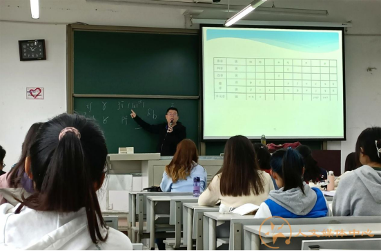 党委书记向仲敏、传播系蒋宁平老师、中文系吴德利老师出席旁听。在课堂上,黄阳老师先与同学们一起回忆了上节课学习的内容,然后开始教授新的语音知识。黄阳老师为使同学们更好理解发音区别,在讲解过程中多次来到同学们中间做发音示范,并请多位来自不同地区的同学演示发音,现场气氛颇为活跃,同学们全程专注听讲。18时15分,课程结束。