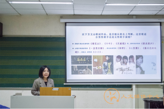 周尚琴老师则介绍了通过歌词文本可以来判断性别身份的方法并举例说明,最后她还大致概括了男歌和女歌的特征。