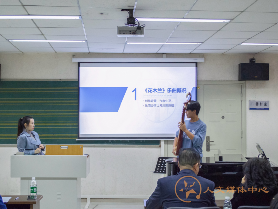 接下来比赛正式开始。第一位出场的是肖蓓老师。她注重与学生们在课堂上的沟通与交流,通过对学生琵琶协奏曲《花木兰》的重点讲解和分析指导,展现了自己的教学方式。